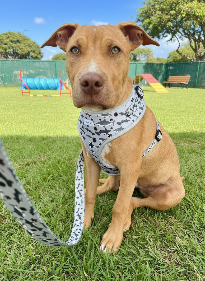 Complete the look with the Shark Tales Leash — designed to match the harness with its clean, ocean-inspired aesthetic.